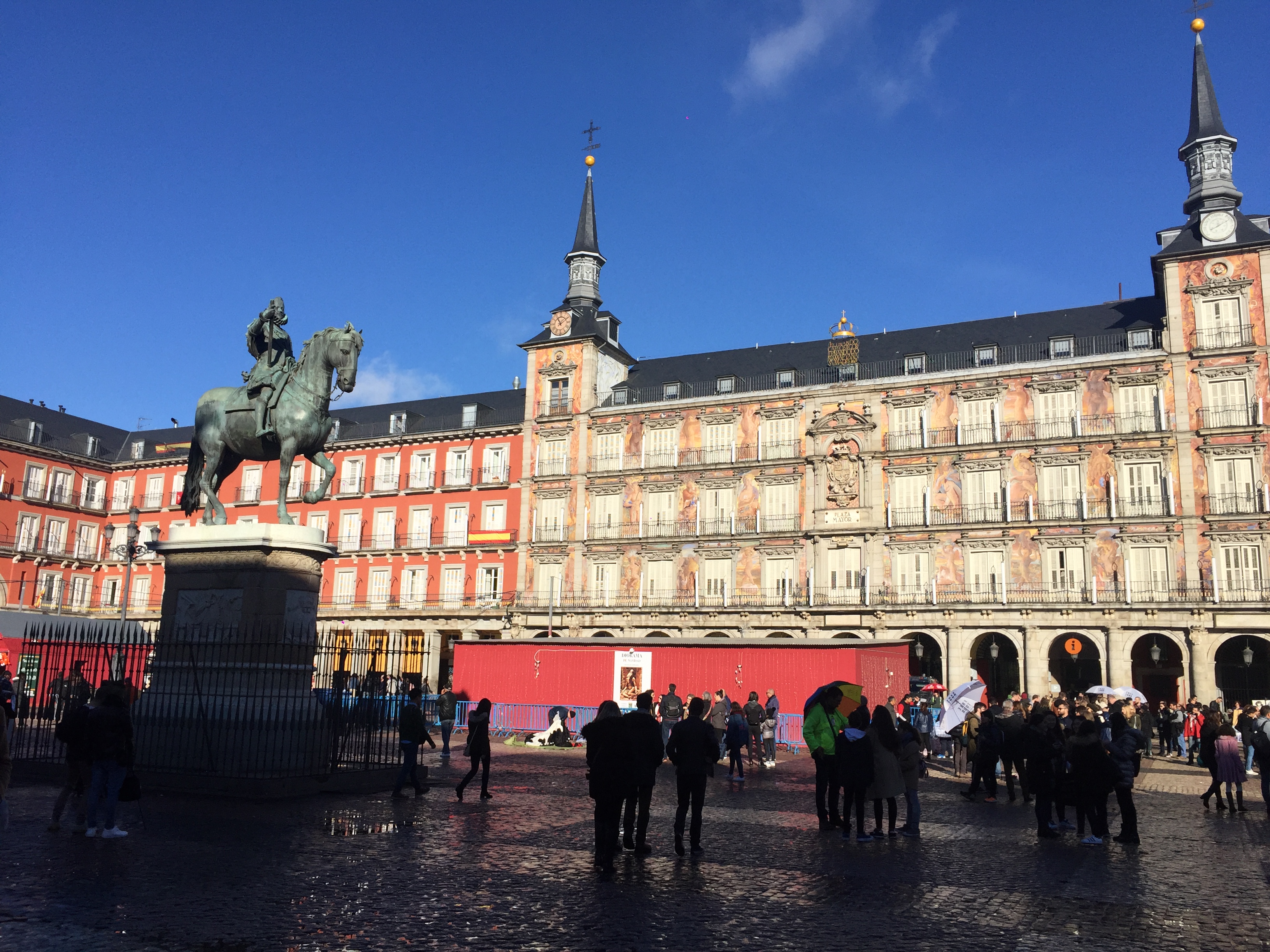 La place emblématique de Madrid, avec sa statue Philippe III, la maison de la Boulangerie (casa de la Panaderia) et l’arc des couteliers (Arco de Cuchilleros).