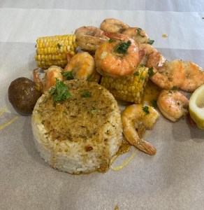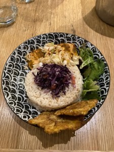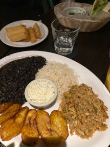 Une nourriture jamaïquaine à base de poulet jerk, riz aux haricots rouges, bananes plantains. Miam.